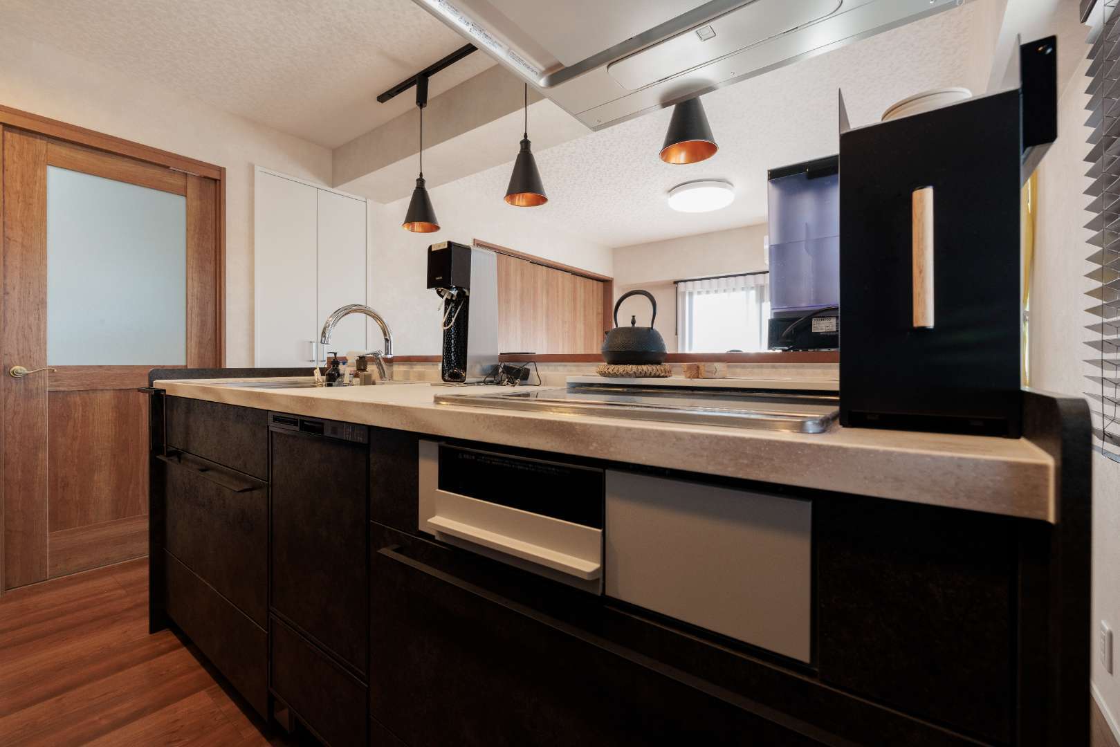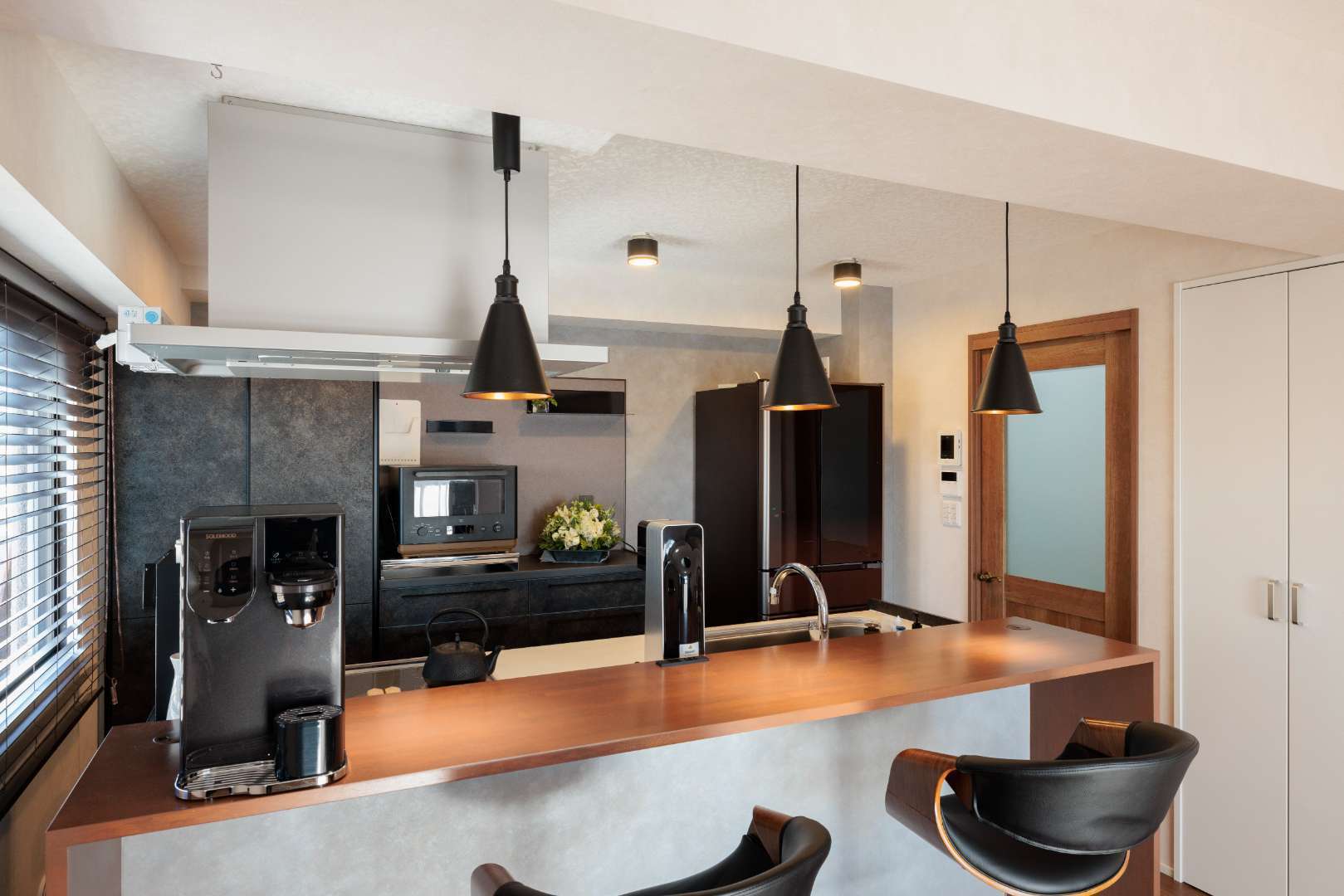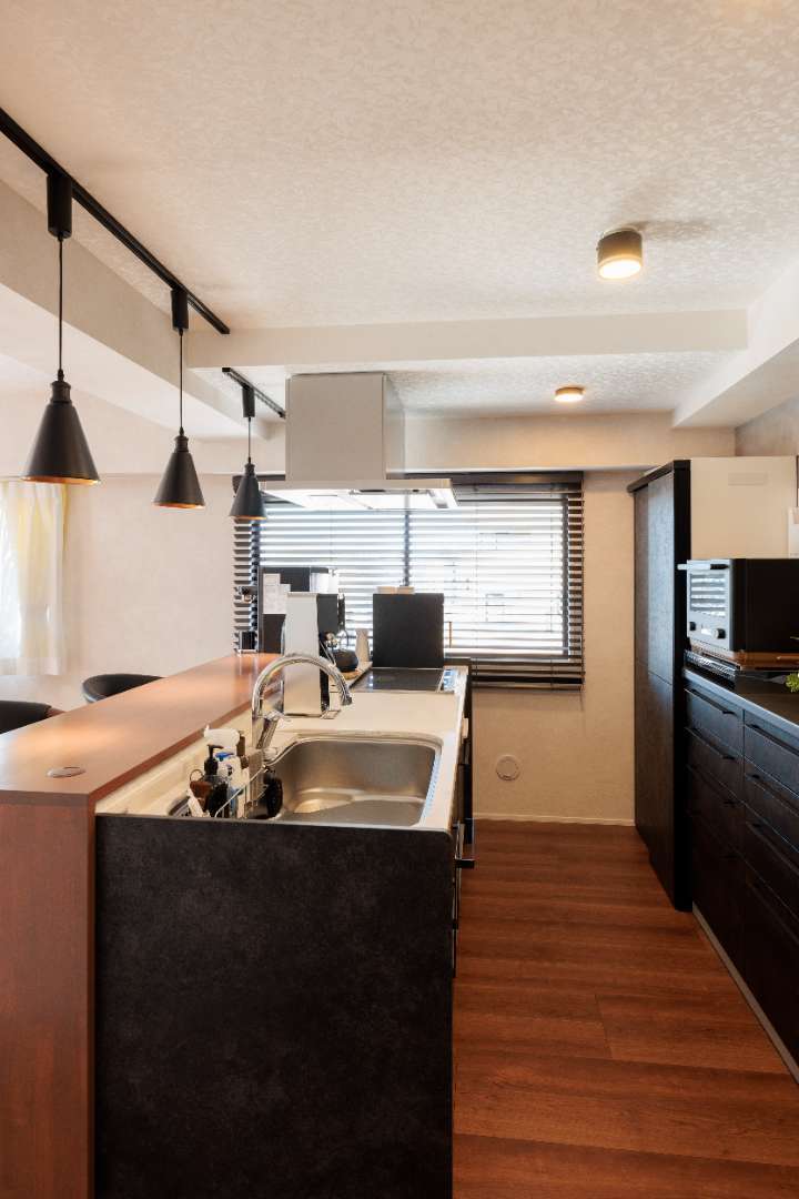 ブラインドの隙間から漏れる光と影が、キッチンカウンターの木目をより美しく引き立ててくれます。