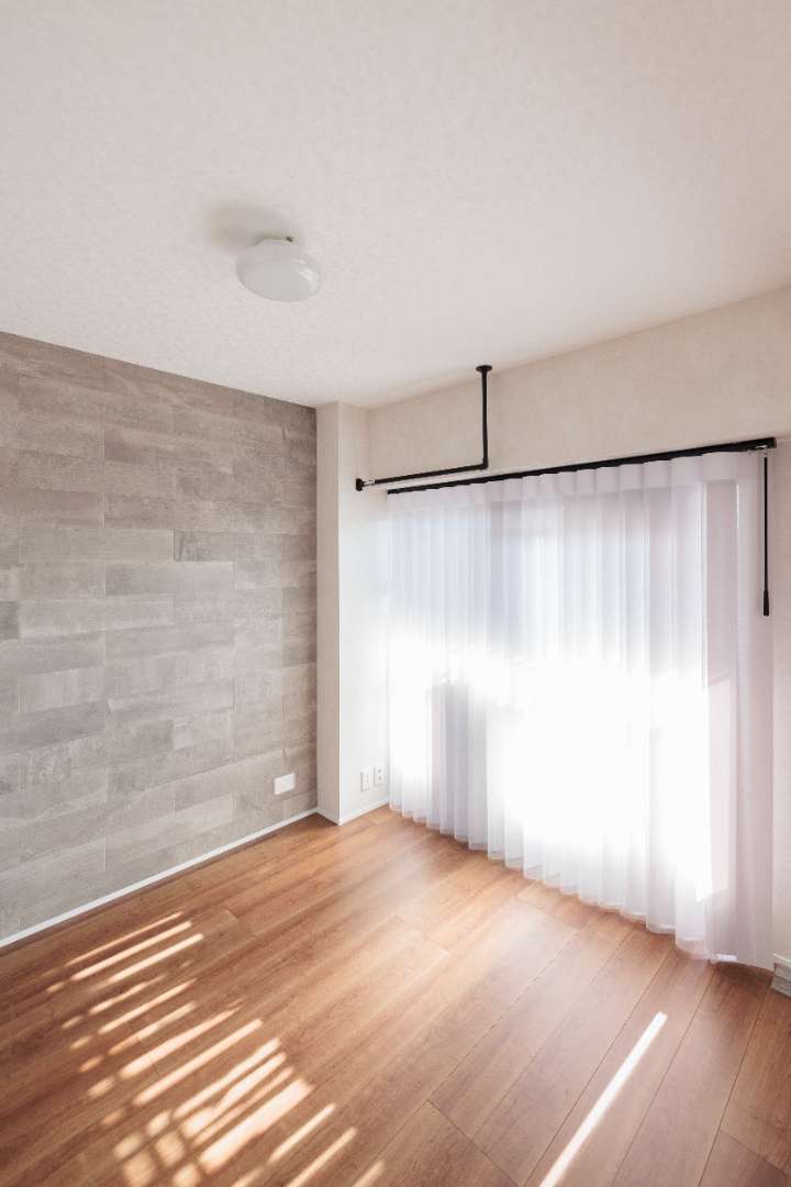 背面壁のグレーのアクセントクロスと、窓辺の木製ブラインドが奥行きを演出しています。