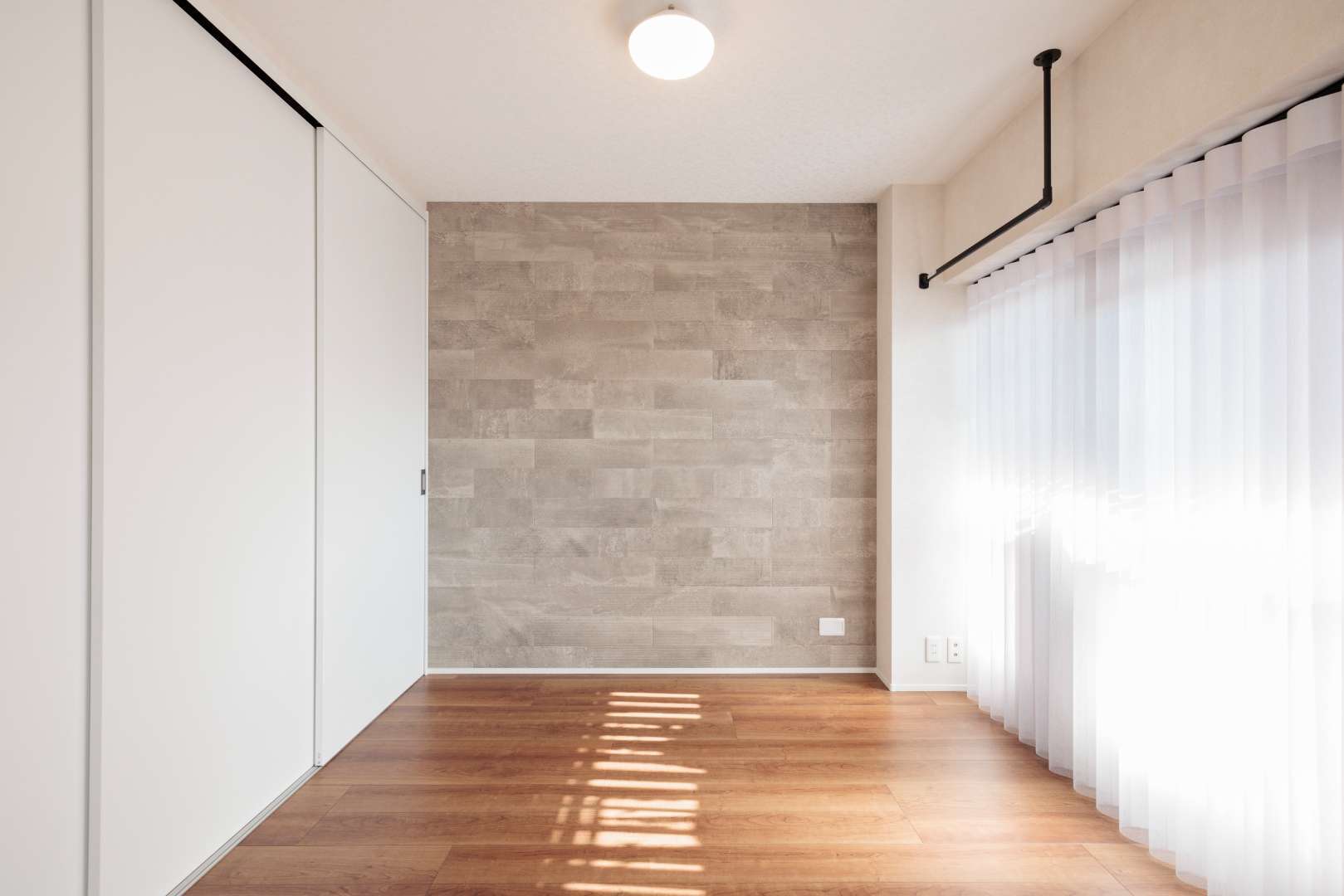 大きな窓から入る自然光を活かすため、カーテンは光をやさしく通す素材を選び、明るさとプライバシーのバランスを整えました。