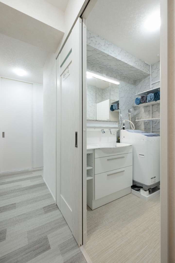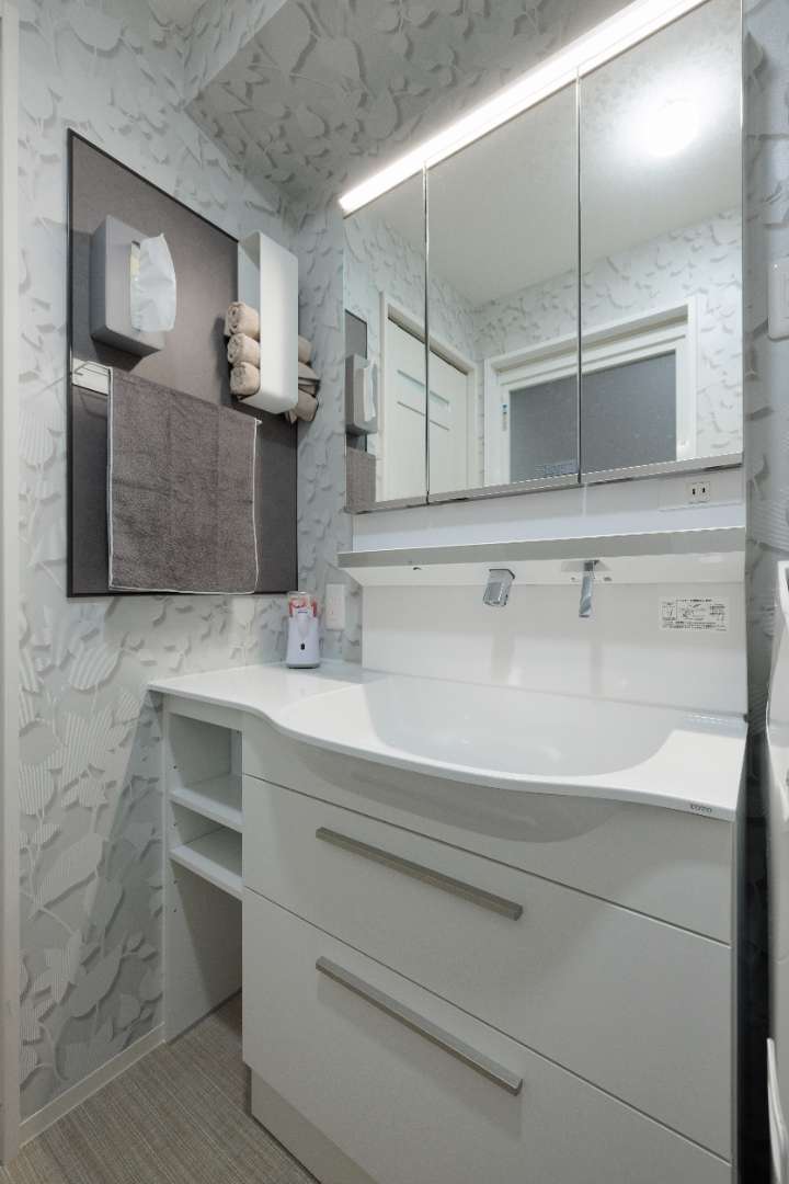壁面には淡いグレーの柄クロスを採用し、シンプルな空間にやわらかな表情をプラス。